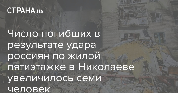 Число погибших из-за удара по многоэтажке в Николаеве увеличилось до семи человек. Один из пострадавших умер в больнице.