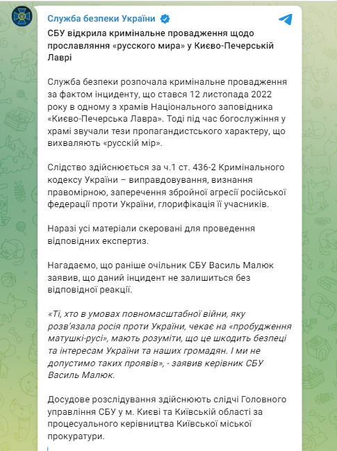 СБУ открыла уголовное производство из-за песни про "матушку-Русь", которую пели в помещении Киево-Печерской Лавры 12 ноября.