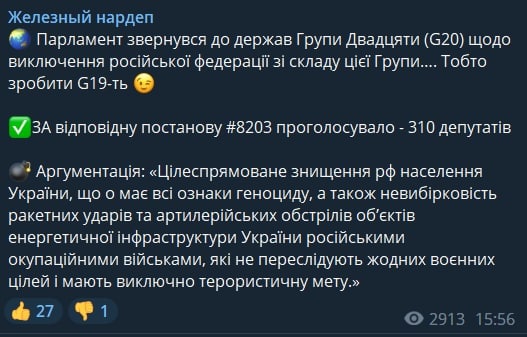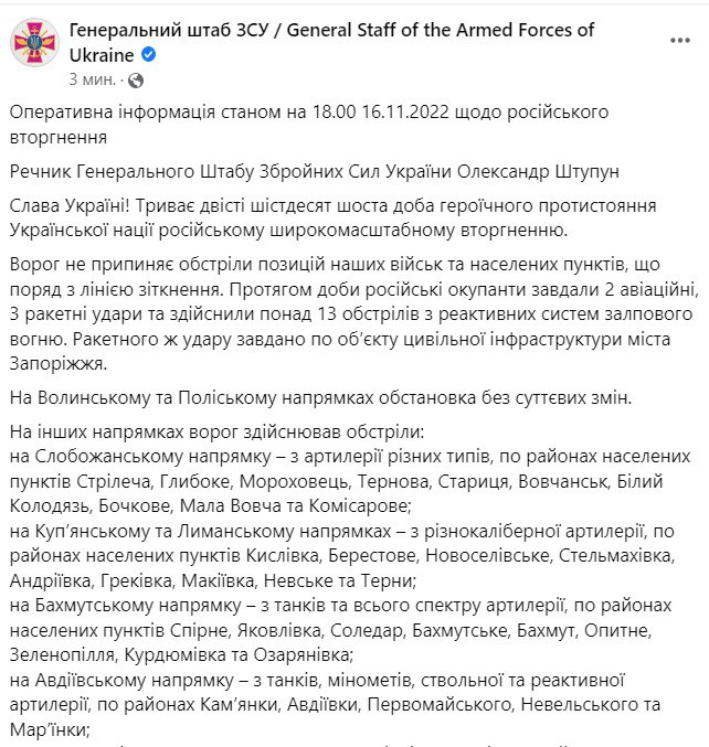 "15 ноября 2022 года произошел очередной многочасовой массированный обстрел всей территории Украины и ее объектов критической инфраструктуры, который вели вооруженные силы Российской Федерации.