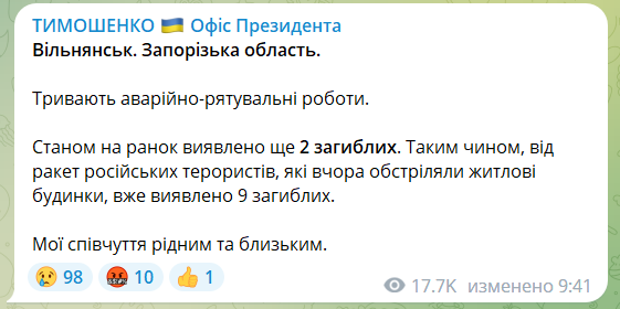 Ранее в вечернем обращении президент Украины Владимир Зеленский сообщал о 7 погибших, заявляя, что число может увеличиться.