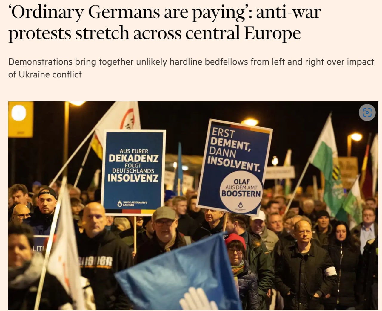 Издание Financial Times пишет о волне протестов против продолжения войны с Россией, которые разворачиваются в Восточной Германии.