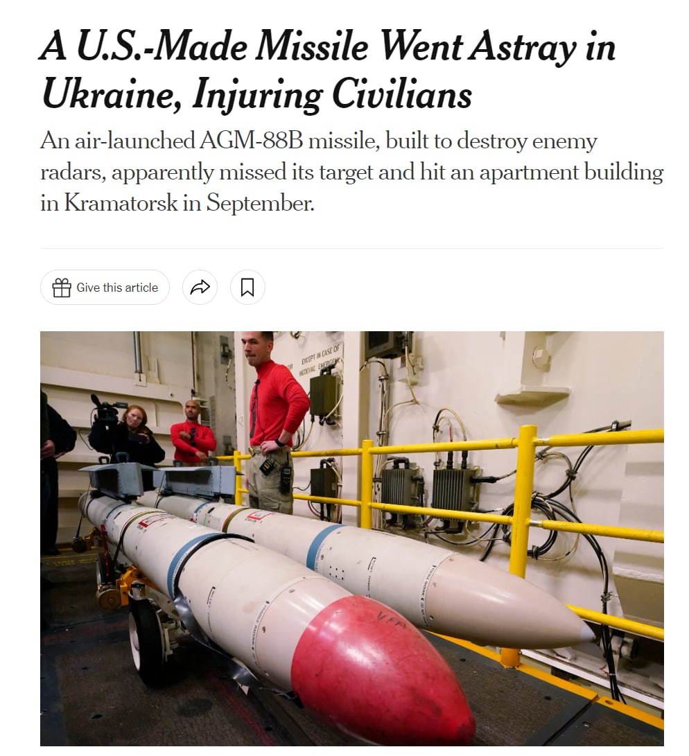 В этом контексте интересно появление статьи New York Times, где говорится, что украинские силы нанесли удар по жилой пятиэтажке в Краматорске (подконтрольная Украине часть Донецкой области) 26 сентября. Издание пишет, что американская противорадиолокационная ракета Harm была запущена с украинского истребителя, но отклонилась от курса, ударила по Краматорску и ранила осколками трех мирных жителей.