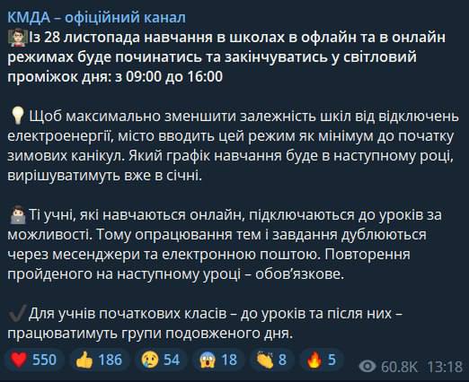 14:10 Обучение только в светлое время суток в школах Киева начинается с 28 ноября.