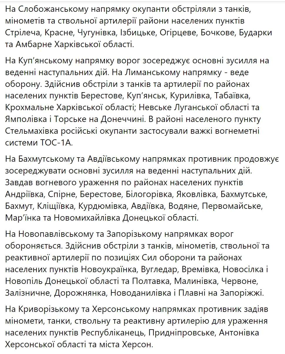 3. Есть изменение по сравнению с предыдущими сводками: в Купянском направлении противник начал наступать, тогда как раньше был здесь в обороне. При этом россияне продолжают обороняться на Лиманском направлении. Наступают россияне на Бахмутском и Авдеевском направлениях, обороняются на Запорожском направлении и под Угледаром. В Криворожском и Херсонском направлениях идут обстрелы населенных пунктов на правом берегу Днепра: Республиканец, Приднепровское, Антоновка Херсонской области и самого Херсона.