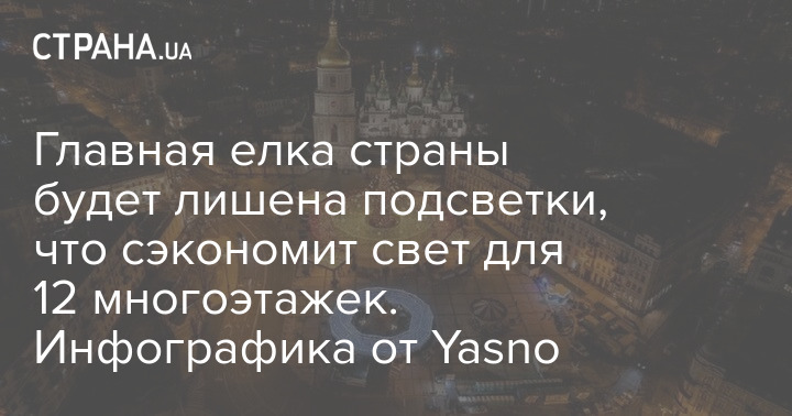 Главная елка Украины, которую установят на Софийской площади Киева, будет лишена иллюминации. Это позволит сэкономить 5,96 МВт электроэнергии в день, что эквивалентно обеспечению светом 12 многоэтажек.