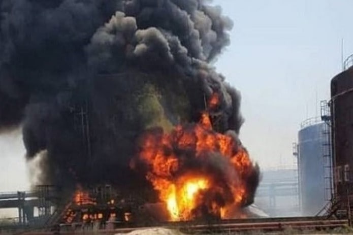 09.31 Еще фото пожара на нефтебазе в Брянской области, где, по данным российских СМИ, был удар беспилотника.