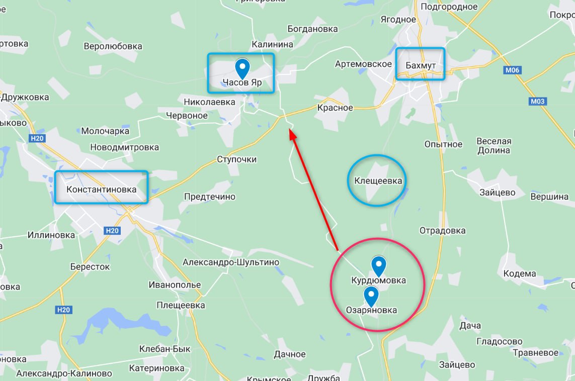 Курдюмовка находится к югу от Бахмута и занимает высоты, позволяющие российской артиллерии наносить удары по соседним Часов Яру и Константиновке.