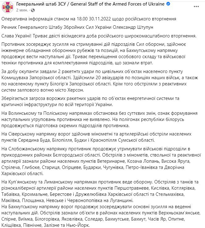 В среду, 30 ноября, в Украине идет уже 280-й день войны с РФ.