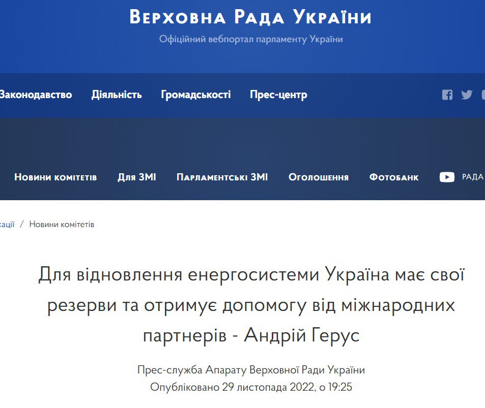 • Рассказал о заседании по вопросу защиты энергетики и связи. Сегодня вечером по стране отключены 6 млн абонентов. Ситуация тяжелее всего в Киеве, Киевской, Одесской, Винницкой, Львовской, Хмельницкой и Черкасской областях.
