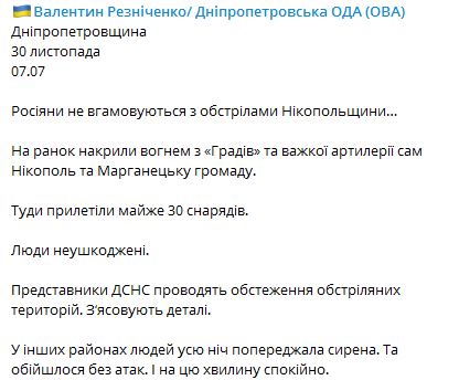 07.45 Утром россияне накрыли огнем из "Градов" и тяжелой артиллерии Никополь и Марганецкую громаду. Туда прилетели около 30 снарядов.