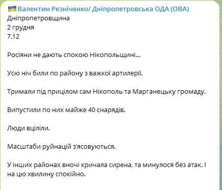 Ночью 2 декабря россияне били из тяжелой артиллерии по Никополю и Марганецкой громаде Днепропетровской области.