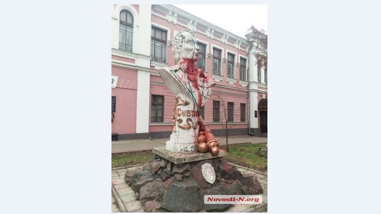Памятник Александру Суворову был открыт в Николаеве в 2010 году. Вандализму такого рода он подвергся впервые.