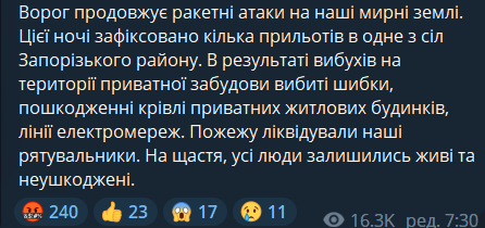 В ночь с 3 на 4 декабря российская армия вновь обстреляла Запорожскую область - зафиксировано несколько прилетов в одном из сел.