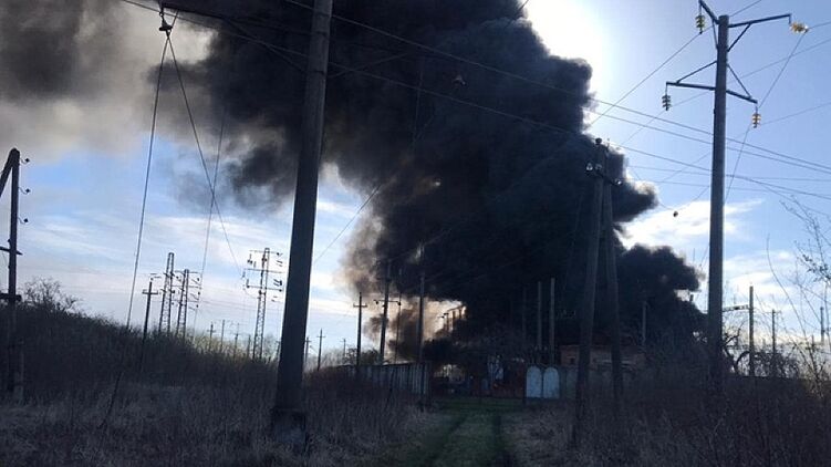 Пожар на тяговой подстанции железнодорожной станции "Красное", возникший в результате ракетного попадания. Фото: tg/Максим Козицкий