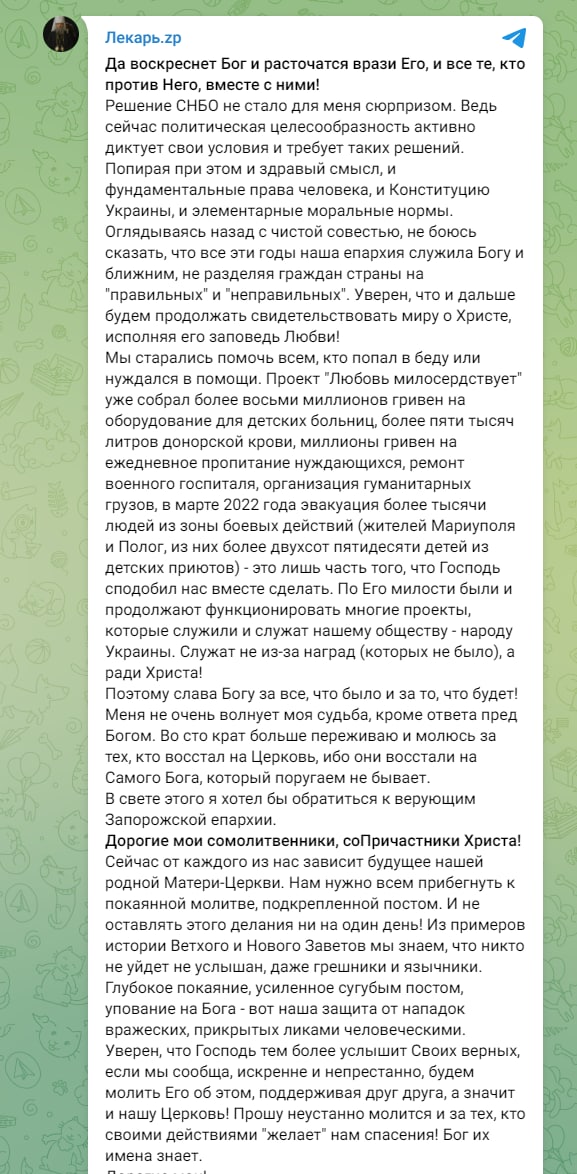 "Решение СНБО не стало для меня сюрпризом. Ведь сейчас политическая целесообразность активно диктует свои условия и требует таких решений. Попирая при этом и здравый смысл, и фундаментальные права человека, и Конституцию Украины, и элементарные моральные нормы", - заявил глава Запорожской епархии УПЦ.