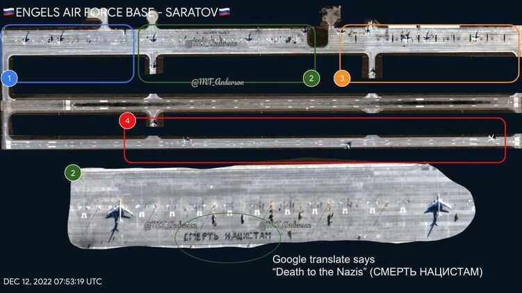 Российские телеграм-каналы публикуют спутниковые фото со ставшего известным аэродрома в Энгельсе Саратовской области, где создали читаемую со спутников надпись "Смерть нацистам".