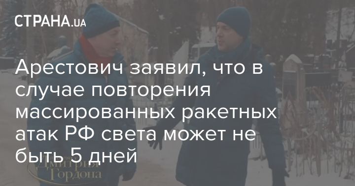 "Они (удары) не сработают. Энергетическая инфраструктура создавалась в советское время в расчете на тотальную ядерную войну с Западом. Она должна была выдержать удары десятками мегатонных ракет по территории Украины. А он (Путин - Ред.) хочет "положить" это "Калибрами", которые не долетают и не попадают? Это нереально абсолютно. Да, по пять дней мы можем быть без света, по три. Не больше. Но это же не блэкаут", - сказал Арестович в интервью Дмитрию Гордону.