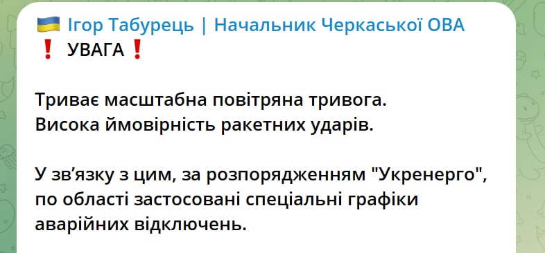 В Черкасской области тоже превентивно отключают свет, сообщил местный губернатор Игорь Табурец.