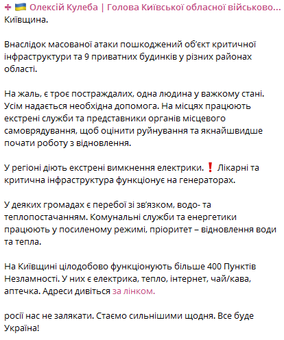 "В некоторых общинах есть перебои со связью, водо- и теплоснабжением. Коммунальные службы и энергетики работают в усиленном режиме, приоритет – восстановление воды и тепла. В Киевской области круглосуточно функционируют более 400 Пунктов Несокрушимости. У них есть электричество, тепло, интернет, чай/кофе, аптечка", - резюмировал он.