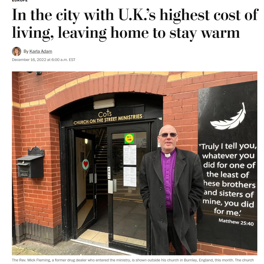Настоятель одной из церквей города Бернли рассказал, что у него стало вдвое больше прихожан из-за того, что люди мерзнут у себя дома. В церкви они пьют горячий чай, а недавно для них организовали горячий душ и услуги прачечной.