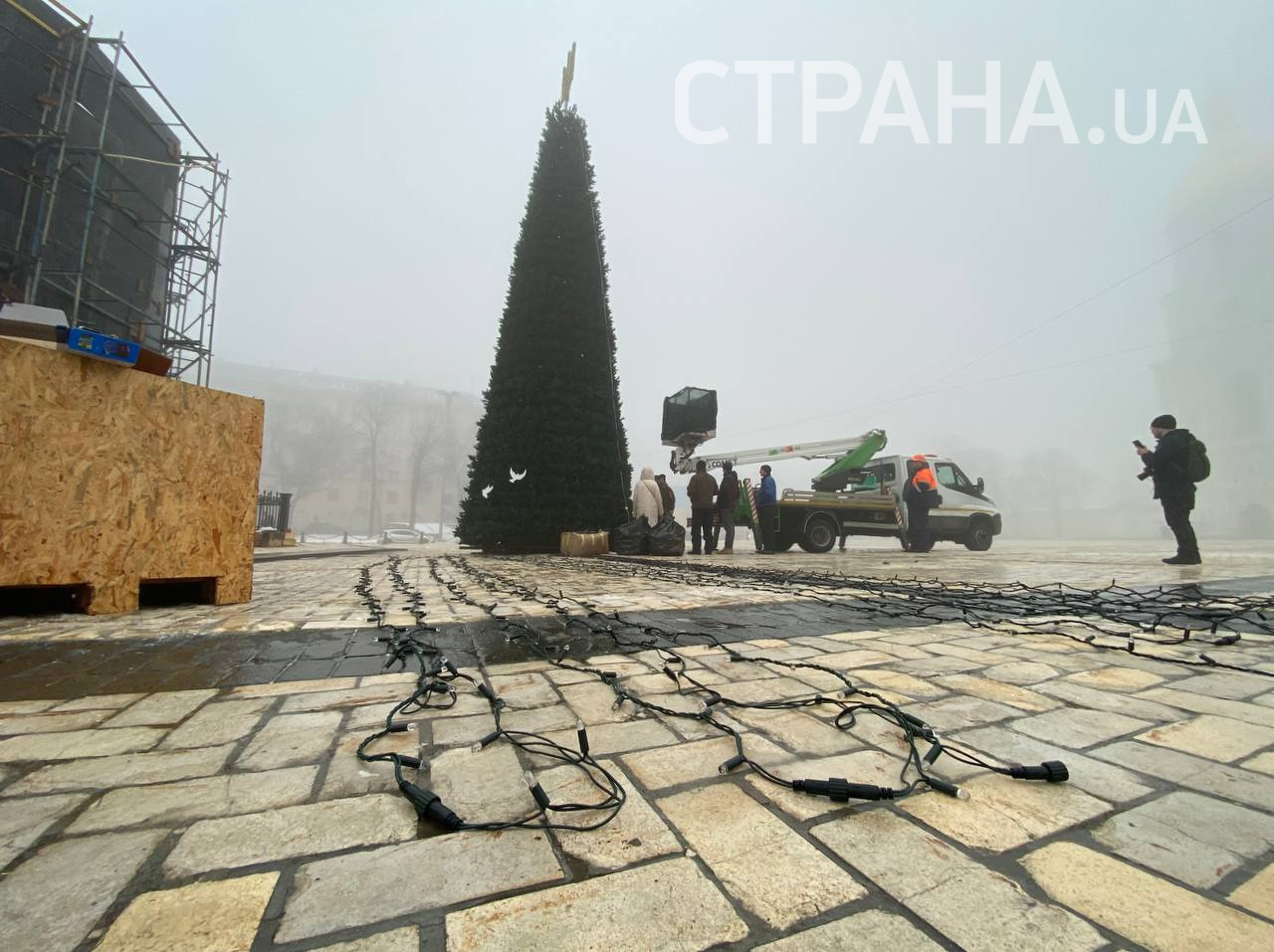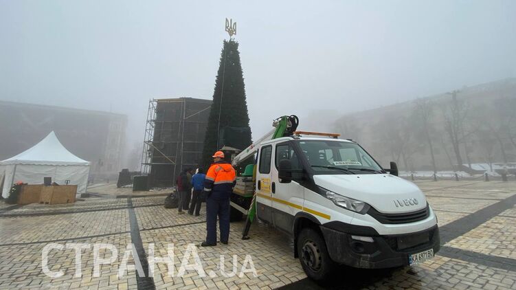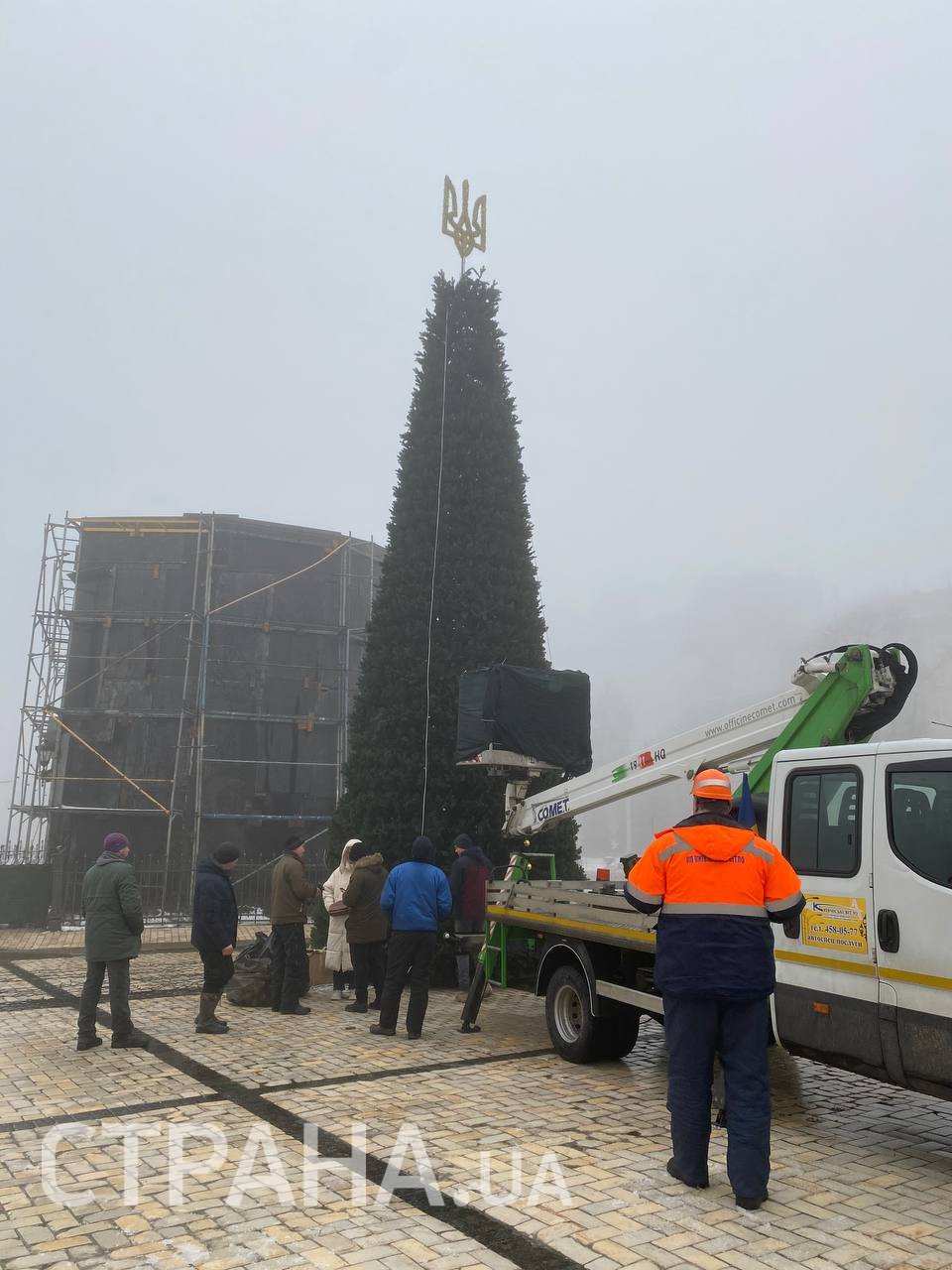 На верхушке елки уже установлен Трезубец (вместо традиционной звезды), а на ветки начинают развешивать елочные игрушки. В этом году главную елку украсят желтыми и синими шарами, которые образуют на елке флаг Украины, а вокруг него разместят фигурки белых голубей.