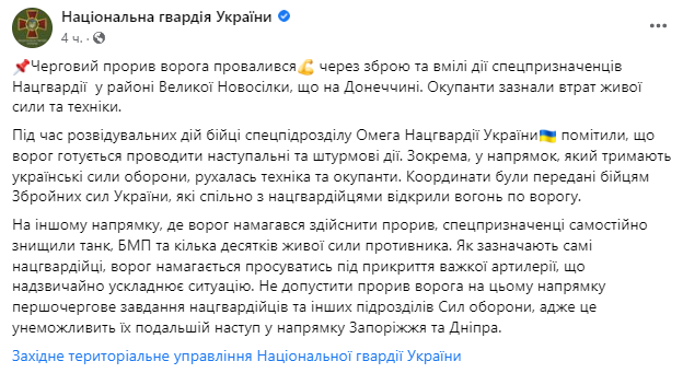 По данным Нацгвардии, ее задача сейчас - предотвратить наступление РФ в направлении Запорожья и Днепра.