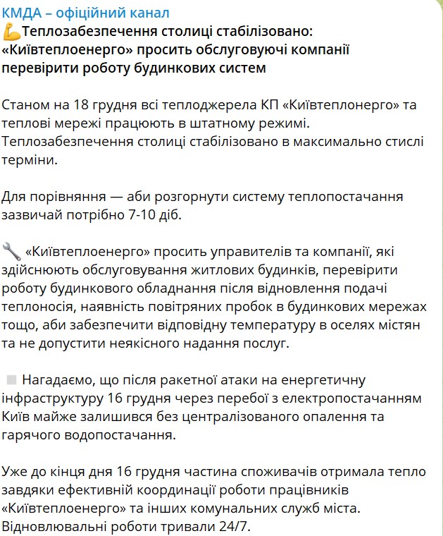 "Наши предприятия, наши две станции были значительно повреждены. Одна 15 декабря, другая 16. К счастью, без жертв, но со значительными разрушениями. Мы занимаемся восстановлением", – сообщил он.