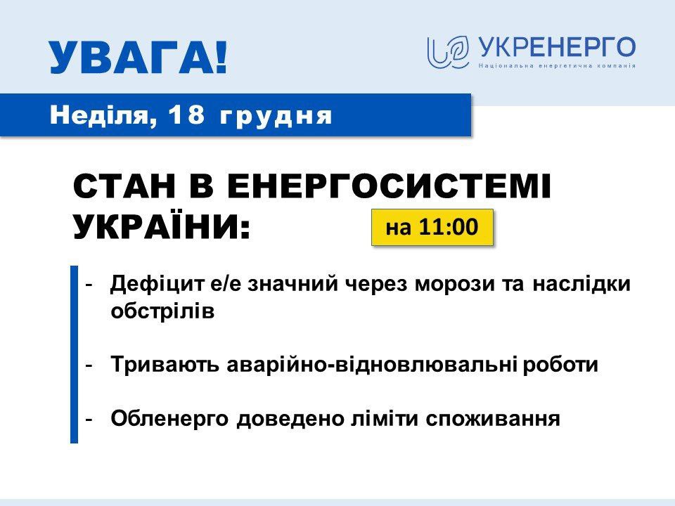 11:03 Атомные станции Украины (кроме Запорожской) вышли на плановую мощность и в целом, ситуация в энергетике страны постепенно стабилизируется после массированного ракетного обстрела. Так описывает "Укрэнерго" ситуацию по состоянию на 18 декабря.