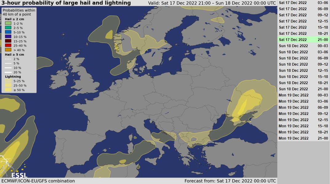 Прогноз вероятности грозы вечером 17 декабря по данным Европейской лаборатории по исследованию конвективных штормов (ESSL). Источник: fb.com/mammatocumulus