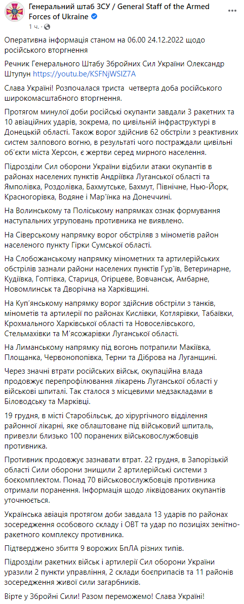 В субботу, 24 декабря, начались 304 сутки русского широкомасштабного вторжения. За прошедшие сутки россияне нанесли 3 ракетных и 10 авиационных ударов, в частности, по гражданской инфраструктуре в Донецкой области. Также враг совершил 62 обстрела из реактивных систем залпового огня, в результате чего пострадали гражданские объекты Херсона, есть жертвы среди мирного населения.