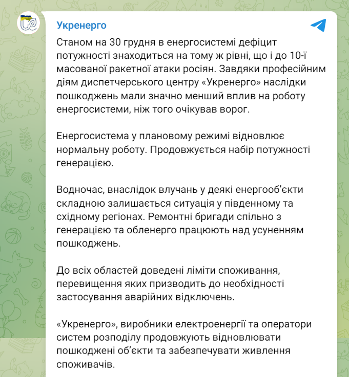 По состоянию на 30 декабря в энергосистеме Украины дефицит мощности находится на том же уровне, что и до 10-й массированной ракетной атаки россиян. Благодаря профессиональным действиям диспетчерского центра "Укрэнерго" последствия повреждений оказали значительно меньшее влияние на работу энергосистемы, чем ожидал враг.