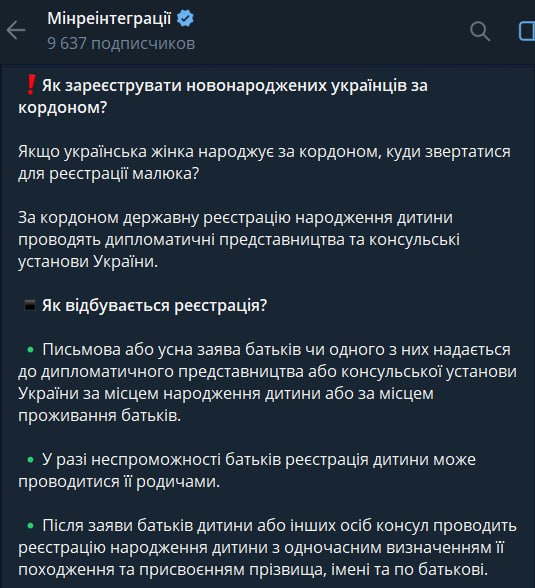 10.55 Минреинтеграции публикует руководство по регистрации новорожденных за границей.