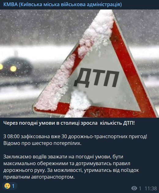 С 8 утра зафиксировано уже 30 аварий, Киевская городская военная администрация сообщает о шестерых пострадавших.