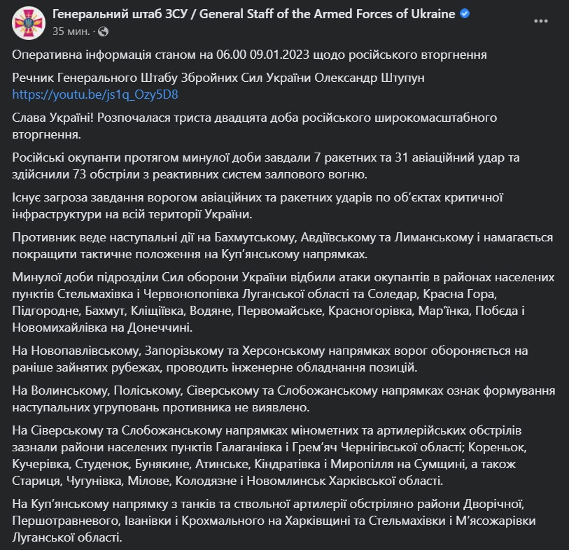 Ранее мы подводили итоги 319-го дня войны. Противник вел наступательные действия на Бахмутском, Авдеевском и Лиманском направлениях - и пытался улучшить тактическое положение на Купянском направлении. После православного Рождества и объявленного россиянами одностороннего перемирия возобновились ракетные удары со стороны РФ. Интенсифицируется переброска российских военных в Беларусь.