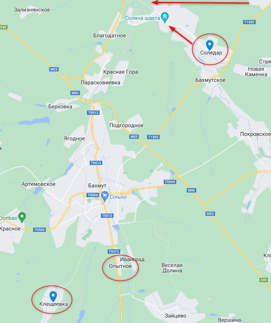 При этом "Институт изучения войны" фиксирует продвижение россиян к югу от Бахмута в районе Опытного, а российские телеграмм-каналы пишут о продвижении армии РФ в Клещеевке. Это важный населенный пункт к юго-западу от Бахмута, через который открывается дорога к трассе на Бахмут из Константиновки и Часов Яра.