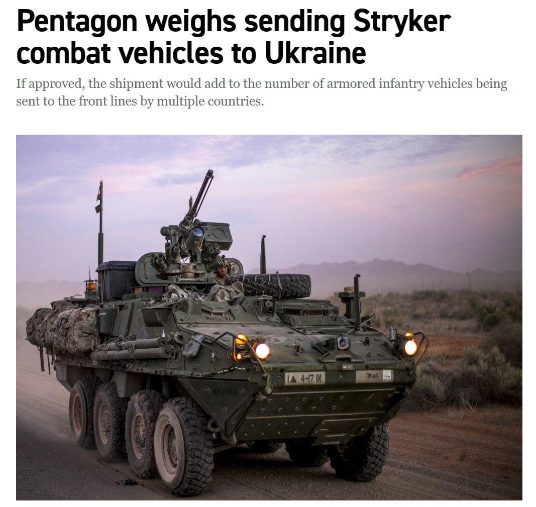 08:34 США рассматривают возможность отправки в Украину боевых бронированных машин Stryker - "чтобы помочь Киеву отразить ожидаемое весеннее наступление России".