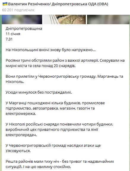 В Днепропетровской области россияне ночью 11 января трижды обстреляли Никопольский район из тяжелой артиллерии.