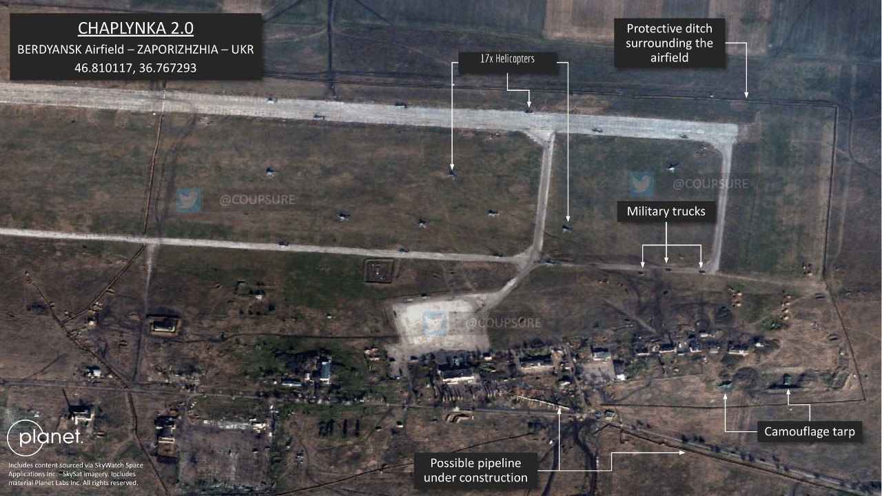 Пользователь Twitter Benjamin Pittet обнародовал спутниковый снимок аэропорта в Бердянске, который россияне обустраивают под базу.