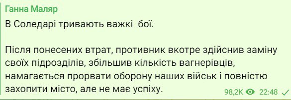 "В Соледаре продолжаются тяжелые бои. После понесенных потерь противник в очередной раз произвел замену своих подразделений, увеличил количество вагнеровцев, пытается прорвать оборону наших войск и полностью захватить город, но не имеет успеха", – написала Маляр.