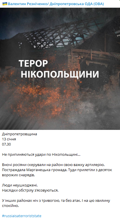 "Не прекращаются удары по Никопольщине. Ночью россияне направили в район свою тяжелую артиллерию. Пострадала Марганецкая громада. Туда прилетели с десяток вражеских снарядов.