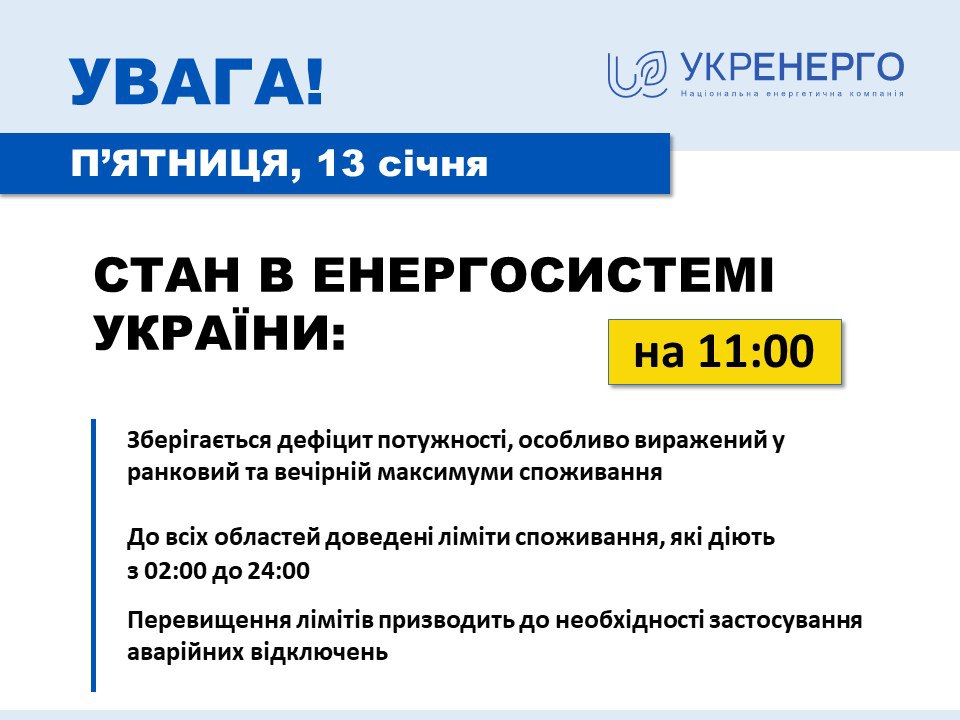 По всей Украине 13 января сохраняется дефицит мощностей в энергосистеме, поэтому до всех областей доведены лимиты потребления и производятся отключения света.