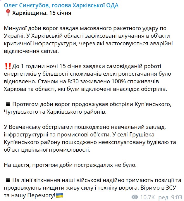 10:00 В Харькове и области по состоянию на это утро к электропитанию подключены 100% потребителей. Об этом заявил губернатор Олег Синегубов.