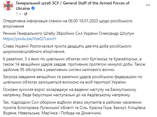 Утром 18 января Генштаб ВСУ обнародовал сводку о ситуации на фронте.