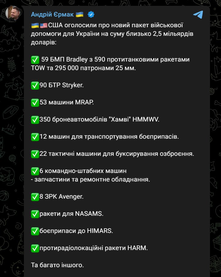 09.30 Глава Офиса президента Ермак опубликовал более детальный список того, что вошло в новый пакет помощи США: