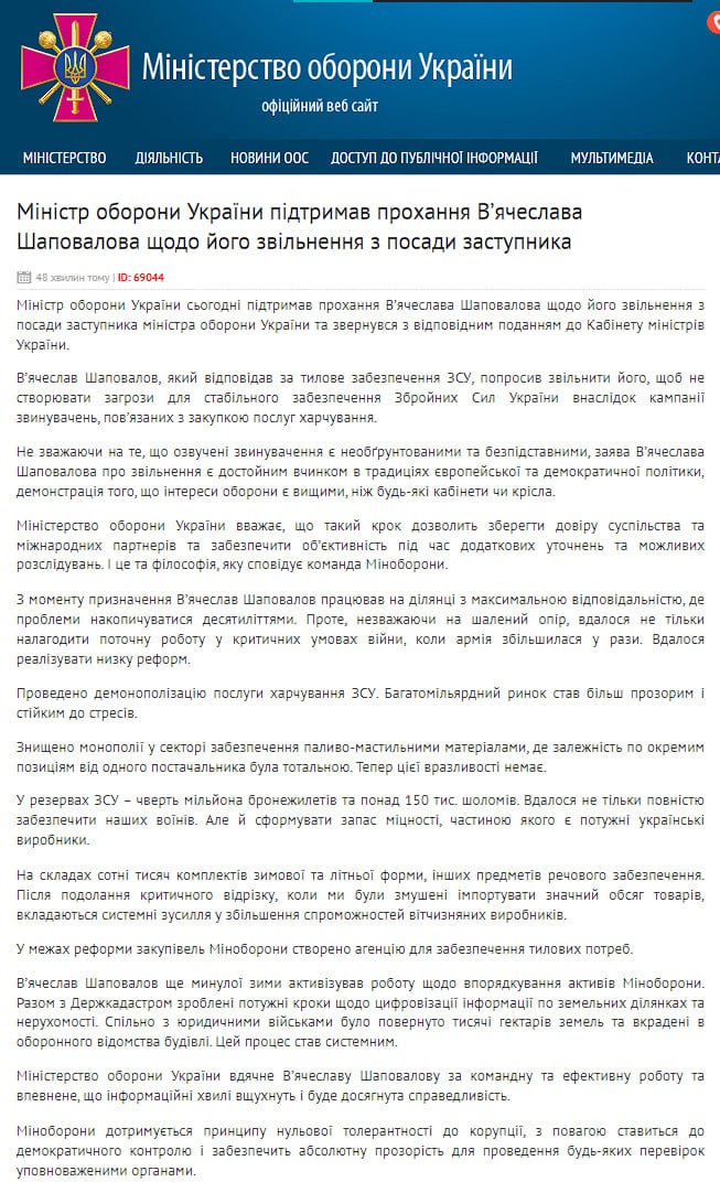 "Несмотря на то, что озвученные обвинения необоснованны и безосновательны, заявление Вячеслава Шаповалова об увольнении является достойным поступком в традициях европейской и демократической политики, демонстрация того, что интересы обороны выше, чем любые кабинеты или кресла", - говорится в сообщении.