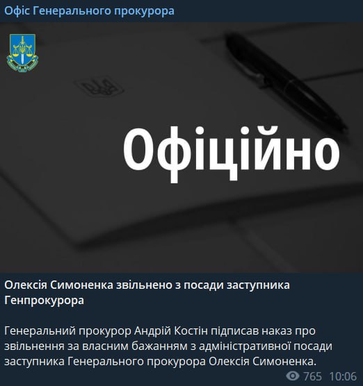 Генпрокурор Костин подписал приказ об увольнении Симоненко по собственному желанию.