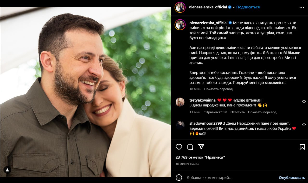 "Меня часто спрашивают, как ты изменился за этот год. И я всегда отвечаю: "Не изменился. Он тот же. Тот самый парень, которого я встретила, когда нам было по семнадцать. Но на самом деле кое-что изменилось: ты гораздо меньше улыбаешься. Например, как на этом фото… Я желаю тебе больше причин для улыбки. И ты знаешь, что для этого нужно. Мы все знаем", - подписала фото с мужем в Instagram Елена Зеленская.