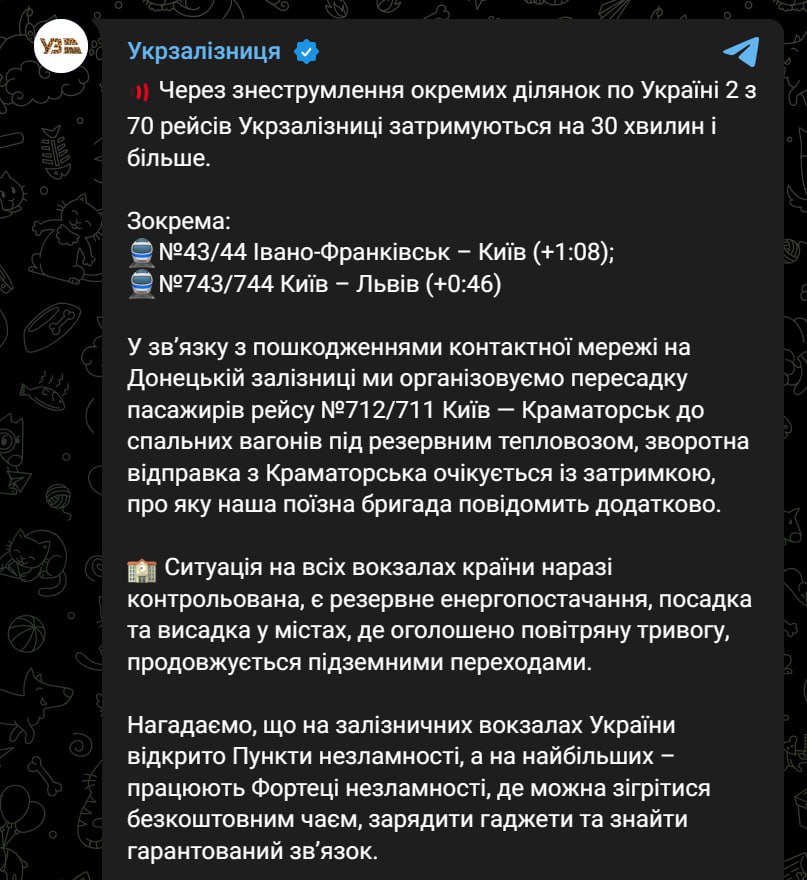 09:43 В Украине после начала ракетной атаки начались задержки поездов.