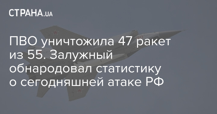 "Силами и средствами противовоздушной обороны Вооруженных Сил Украины уничтожены 47 крылатых ракет, 20 из них в районе столицы. Кроме того, три из четырех управляемых авиационных ракет Х-59 не достигли своих целей. Цель россиян остается неизменной – психологическое давление на украинцев и разрушение критической инфраструктуры", - написал Залужный.