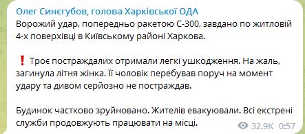 Об этом сообщил глава Харьковской ОВА Олег Синегубов.